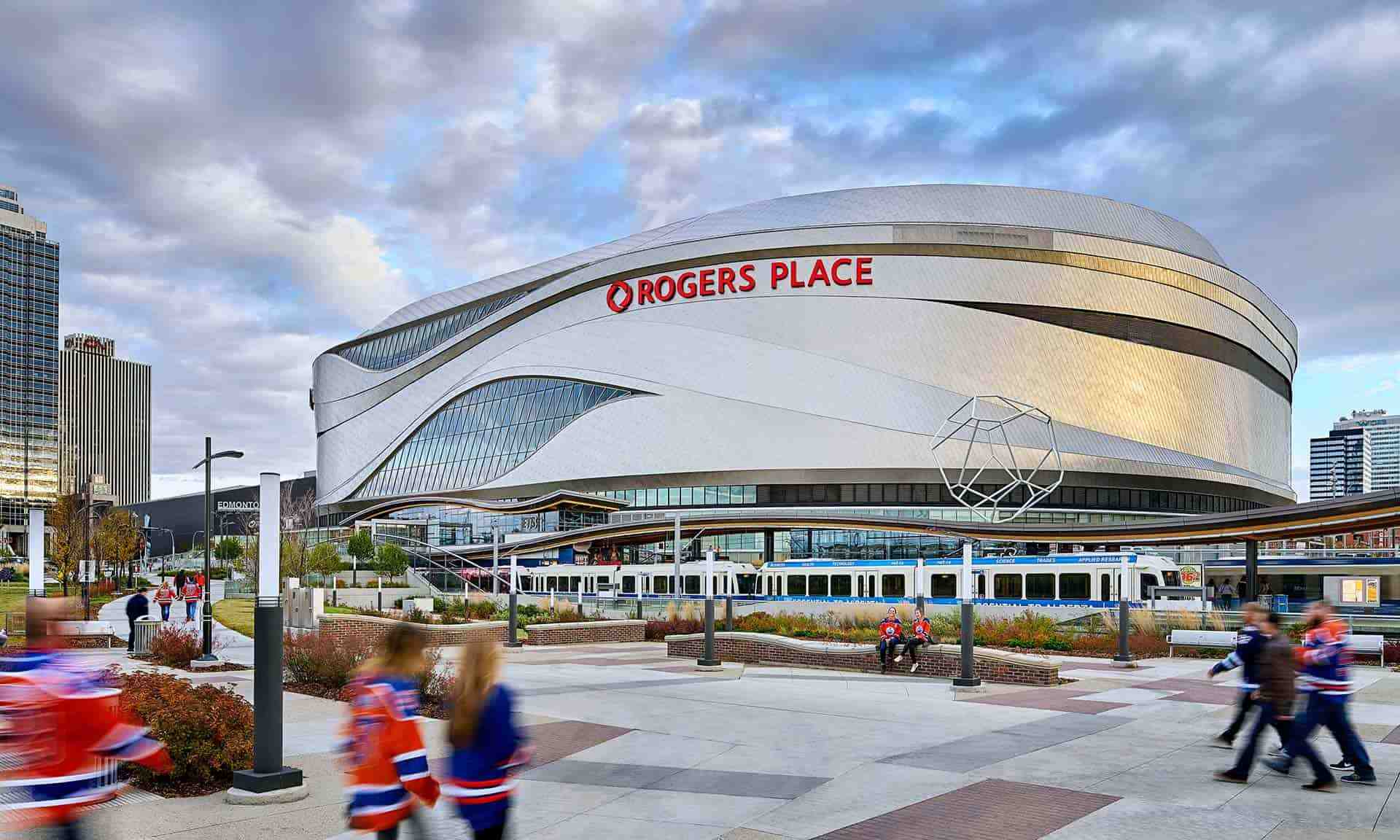 Exterior photo of Rogers Place with Edmonton Oilers fans walking around the precinct.