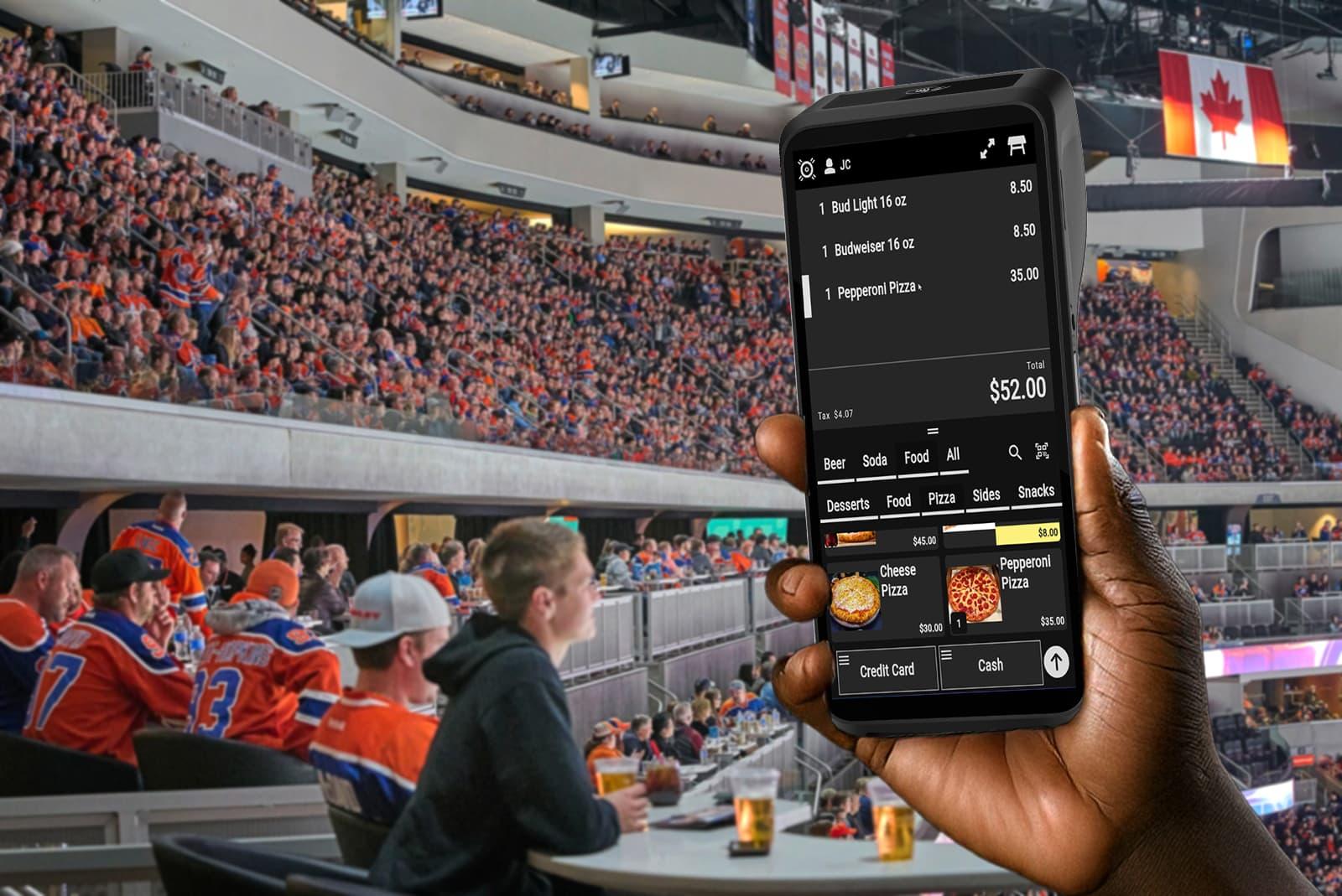MyVenue POS software on a handheld POS device at Rogers Place.